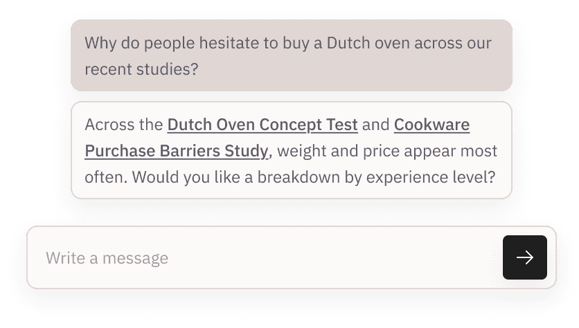 Ask questions across studies to pull patterns like “top pain points in onboarding,” “language users use for X,” or “differences by segment.” to uncover the findings that impact your product roadmap and development most.